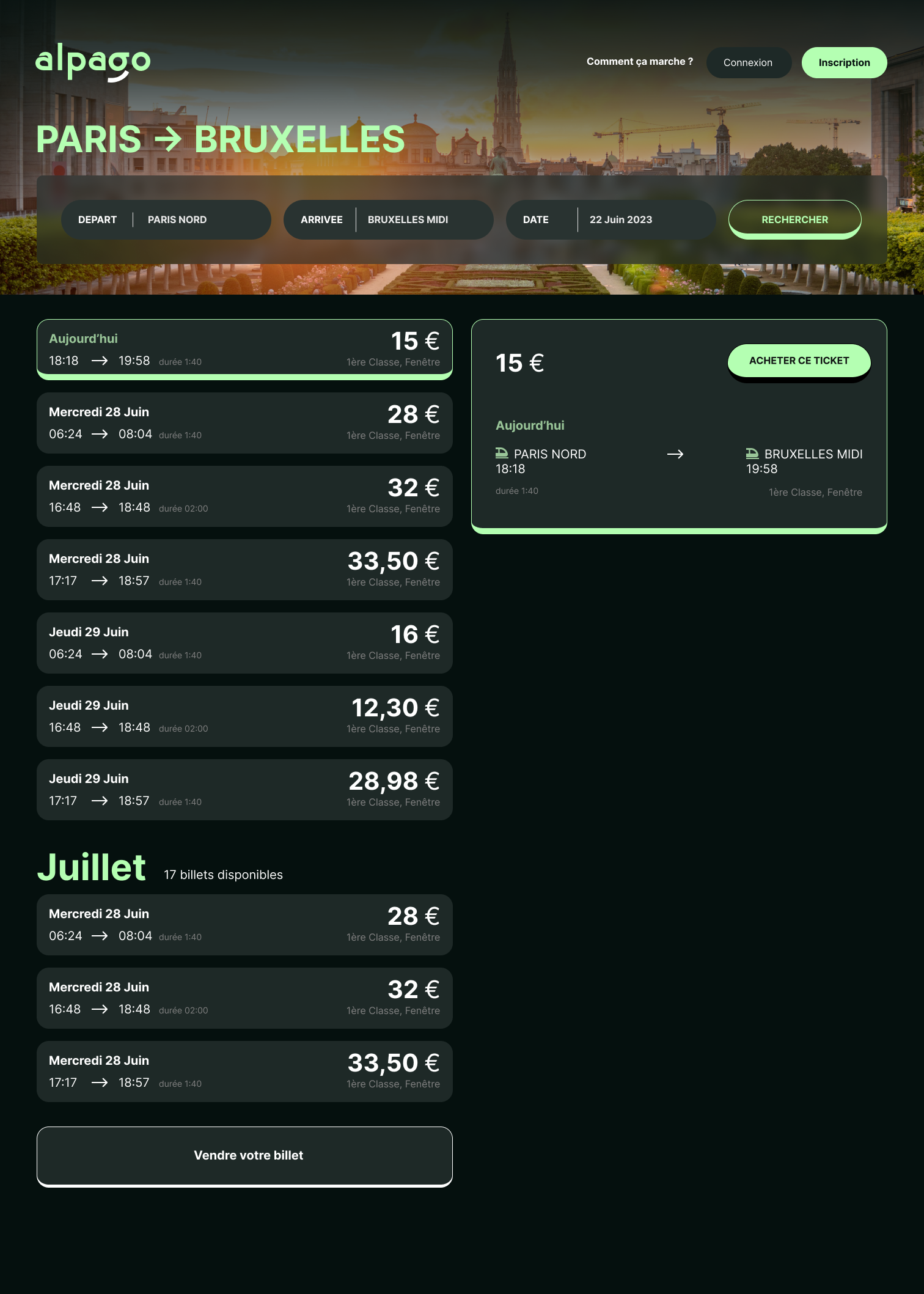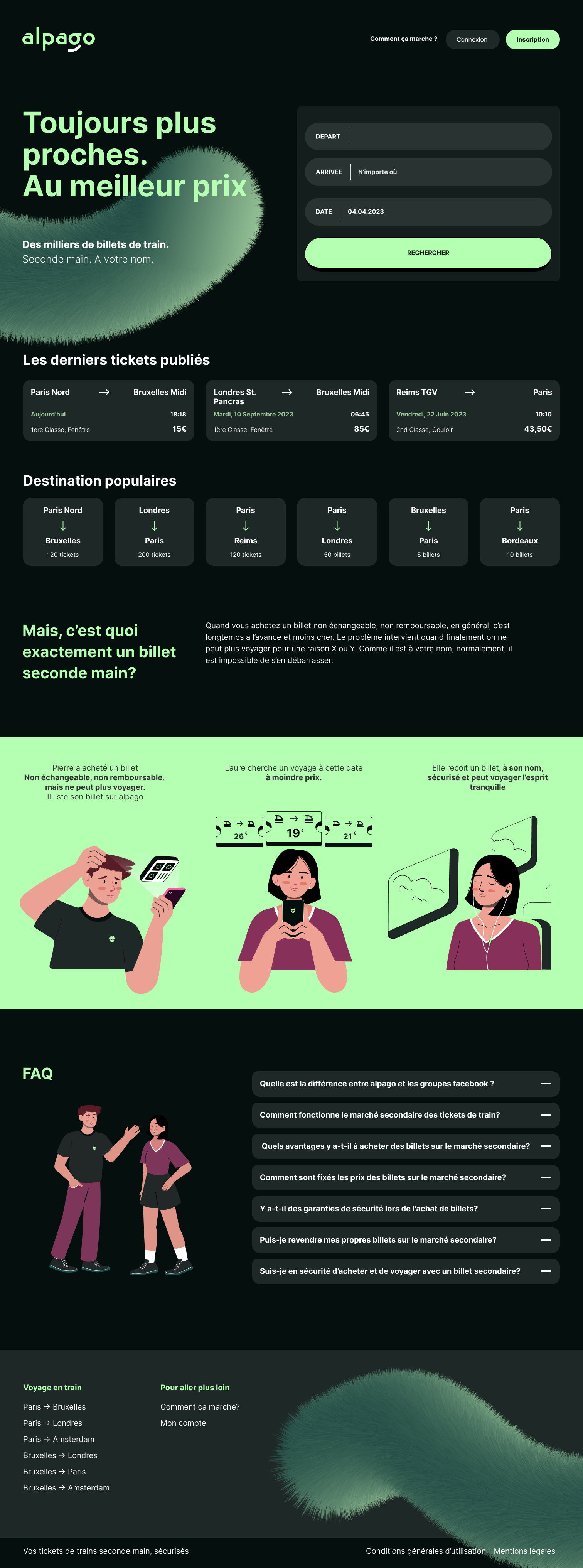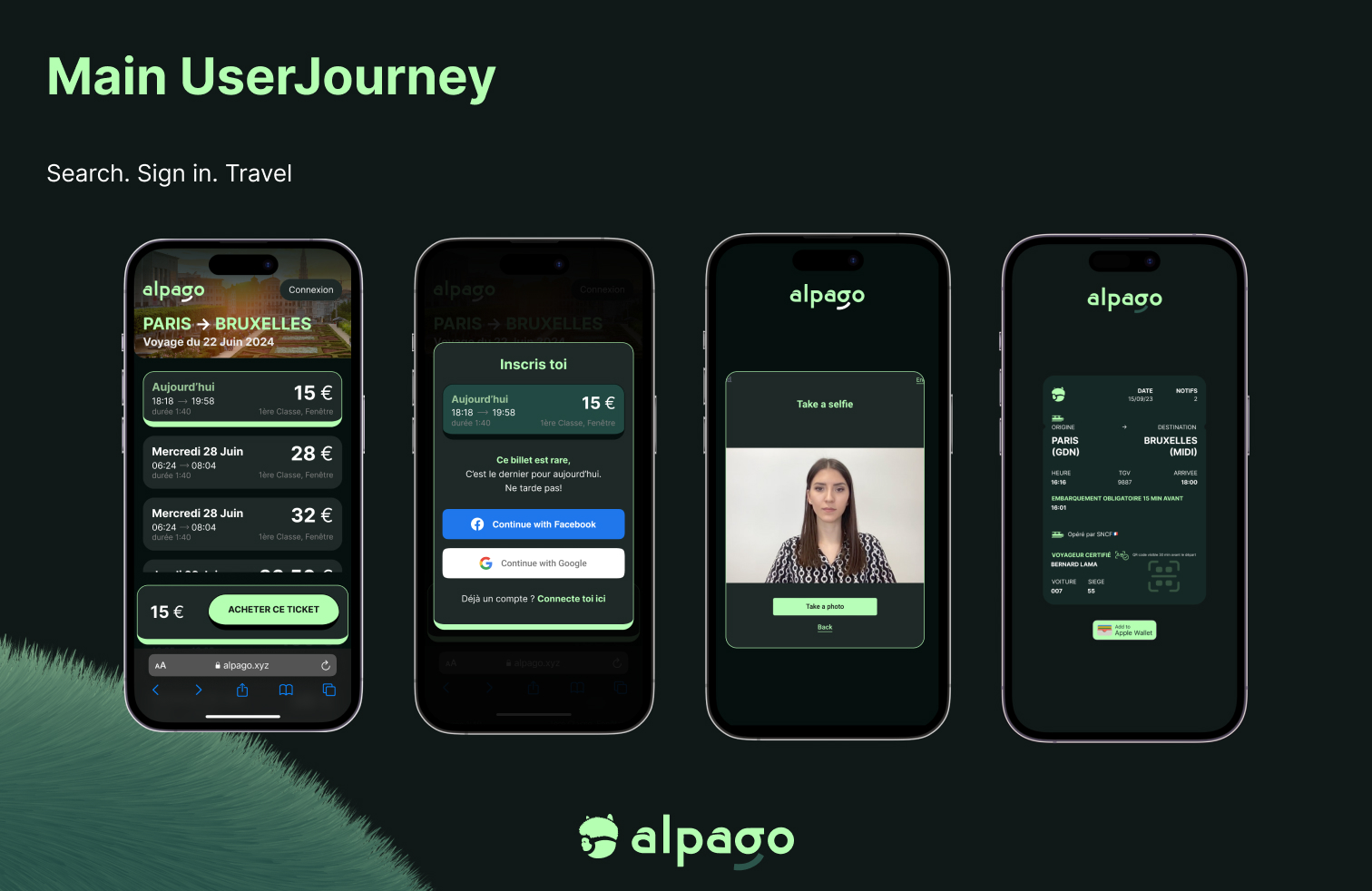 Alpago is a startup that secures the secondary market for train tickets using blockchain technology. The idea came to me in 2018 when I met a girl in a bar in Paris, but unfortunately, she lived in Brussels. As a result, I often had to take last-minute trips. I officially founded Alpago in 2024 and handled the logo, branding, and website design.