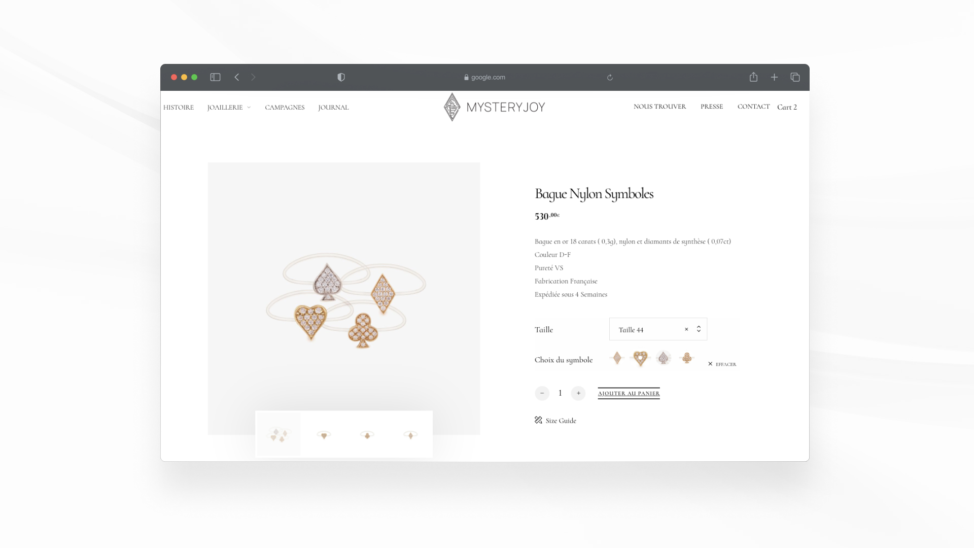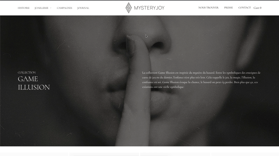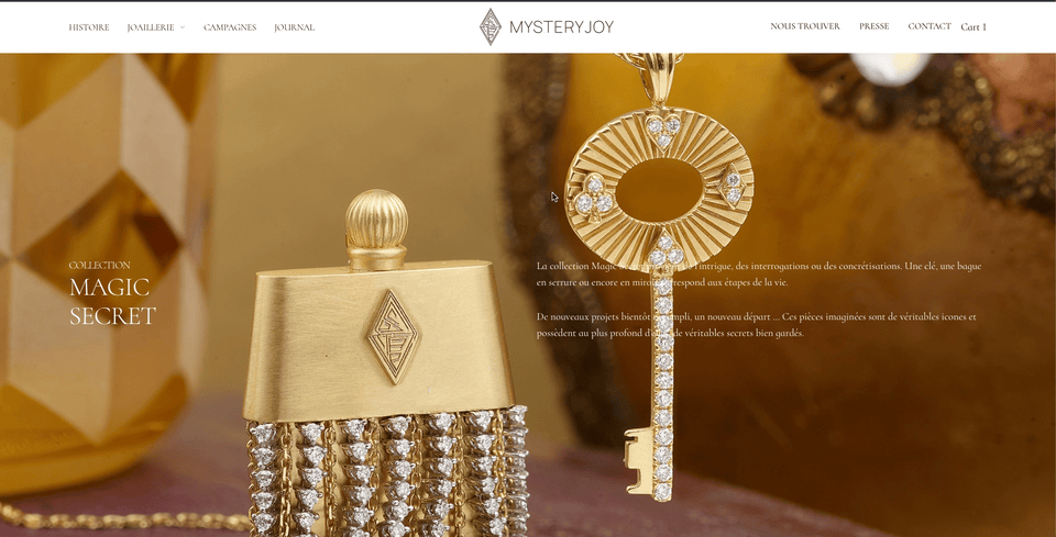 MysteryJoy is quite forward-thinking. Long before it became a trend, the brand ventured into the production of non-bloody diamonds, specifically synthetic diamonds. Now recognized for its true value, I’m proud to have supported the brand in its early stages. I had the pleasure of creating the logo from A to Z, the dreamlike universe, the initial artistic direction, and the sprawling e-commerce website.